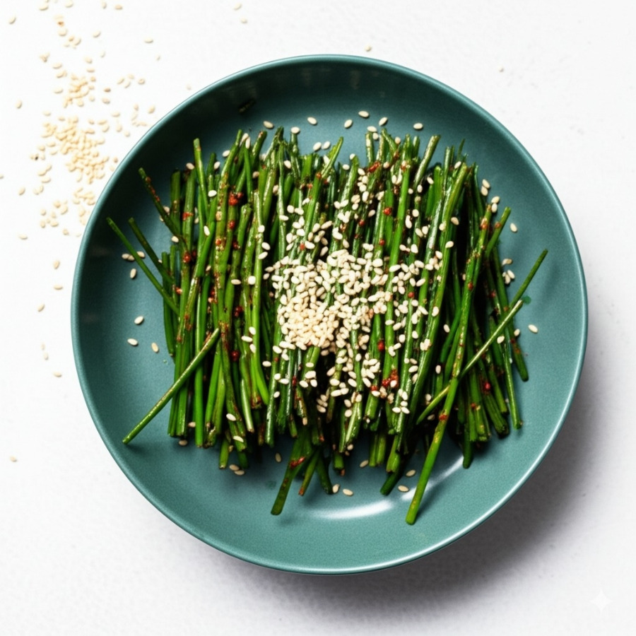 <이미지: 완성된 부추겉절이를 접시에 담고 통깨를 뿌려 마무리하는 모습>