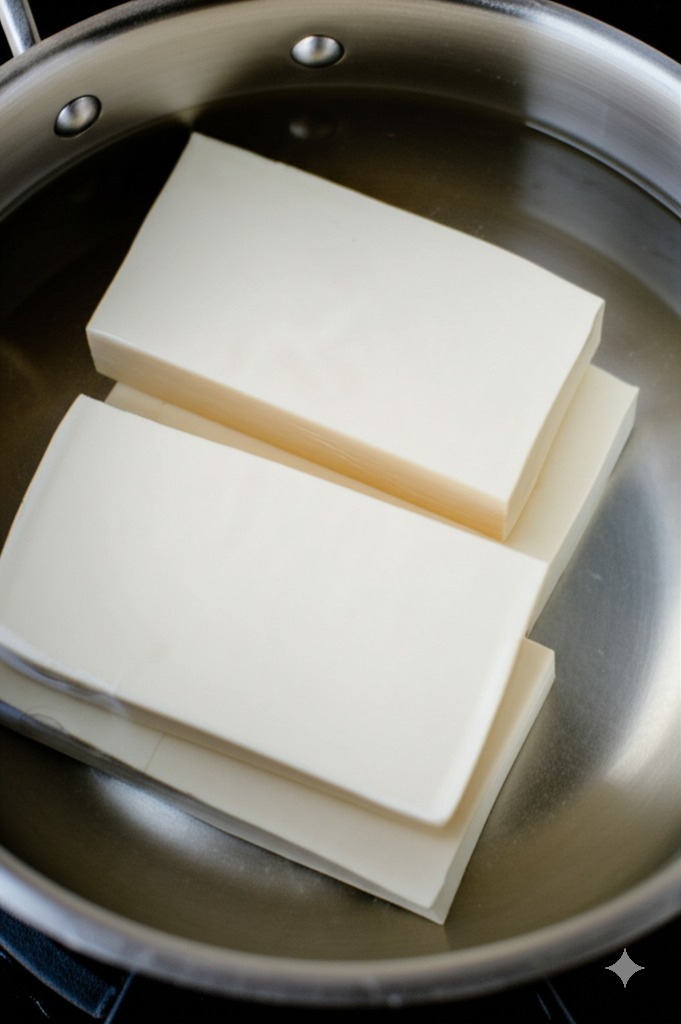 물이 끓으면 두부를 넣고 2~3분 정도 데쳐줍니다. (너무 오래 데치면 두부가 단단해질 수 있어요.)