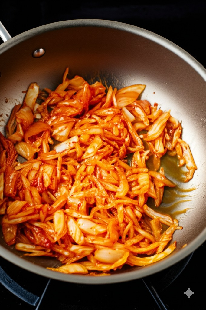 <이미지: 완성된 볶음김치에 참기름을 둘러 윤기를 더하는 모습>