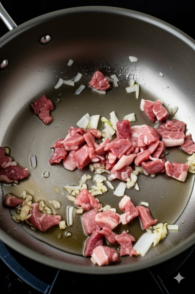 <이미지: 팬에 돼지고기를 넣고 볶는 모습, 마늘을 넣어 함께 볶는 모습>