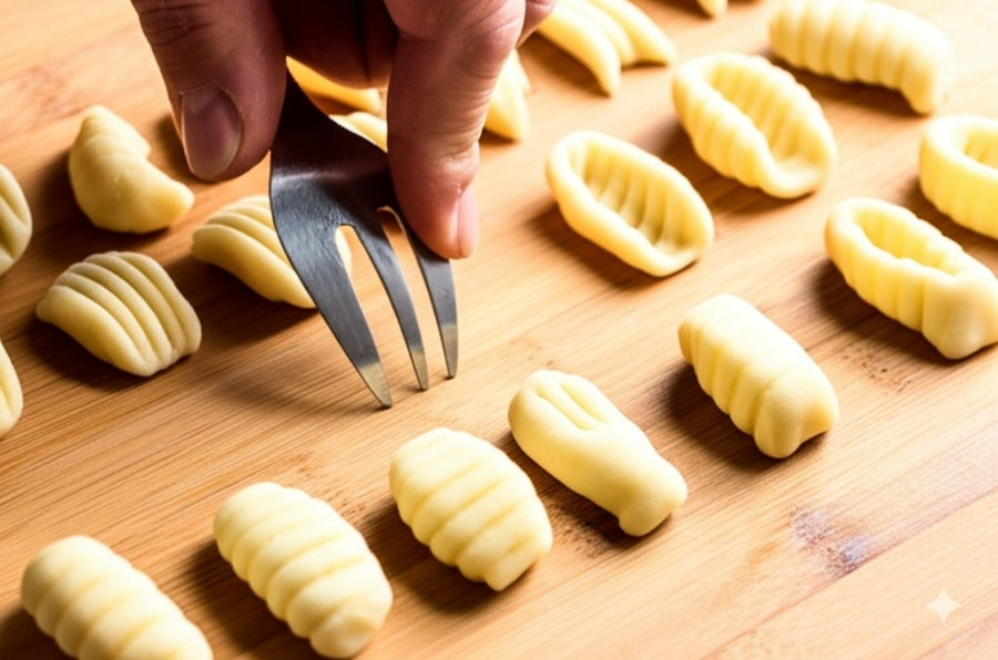 포크 뒷면이나 뇨끼 전용 도구를 이용하여 꾹 눌러 뇨끼 특유의 홈을 만들어줍니다. 홈을 만들면 소스가 더 잘 배어듭니다.
