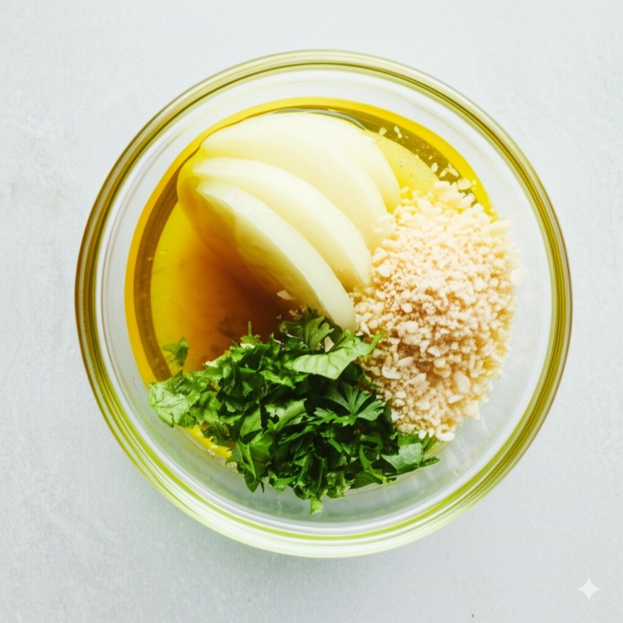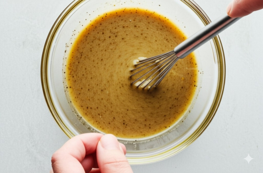 ① 작은 볼에 올리브 오일, 화이트 와인 식초 (또는 레몬즙), 꿀 (또는 메이플 시럽), 디종 머스타드를 넣고 잘 섞어줍니다.