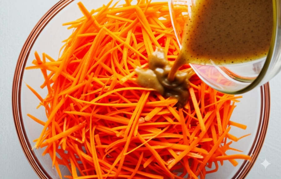<이미지: 채 썬 당근과 양파에 드레싱을 붓는 모습>