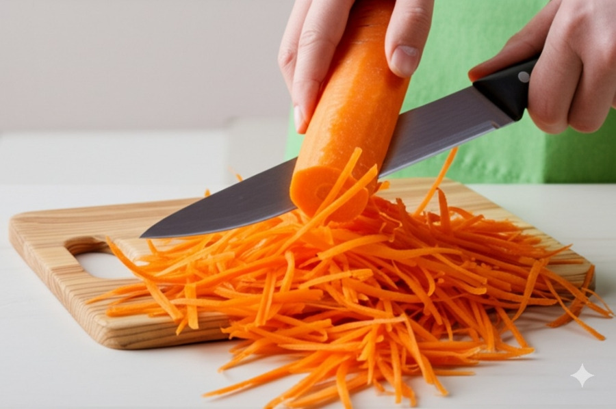 <이미지: 채칼로 당근을 가늘게 채 써는 모습>