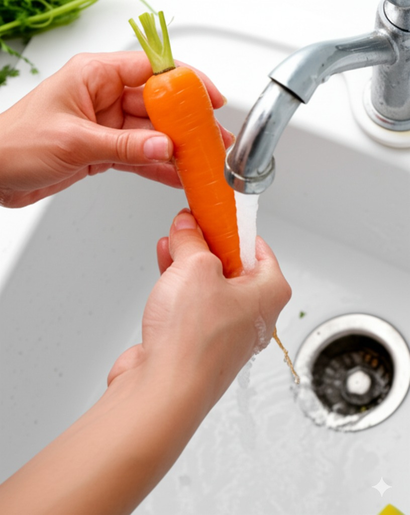 <이미지: 흐르는 물에 당근을 씻는 모습>