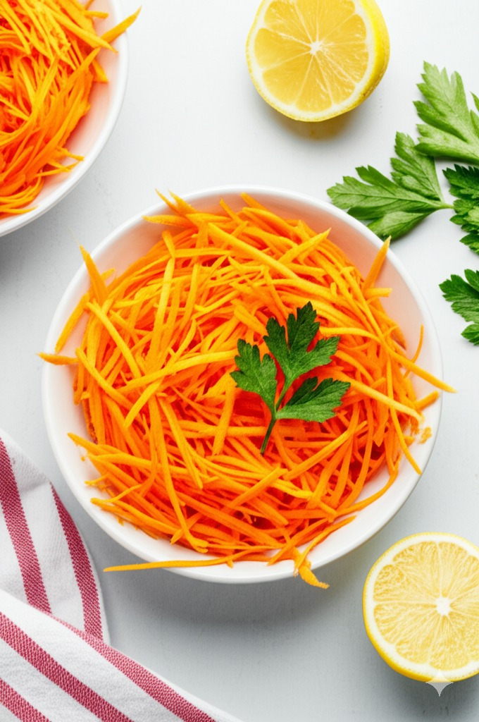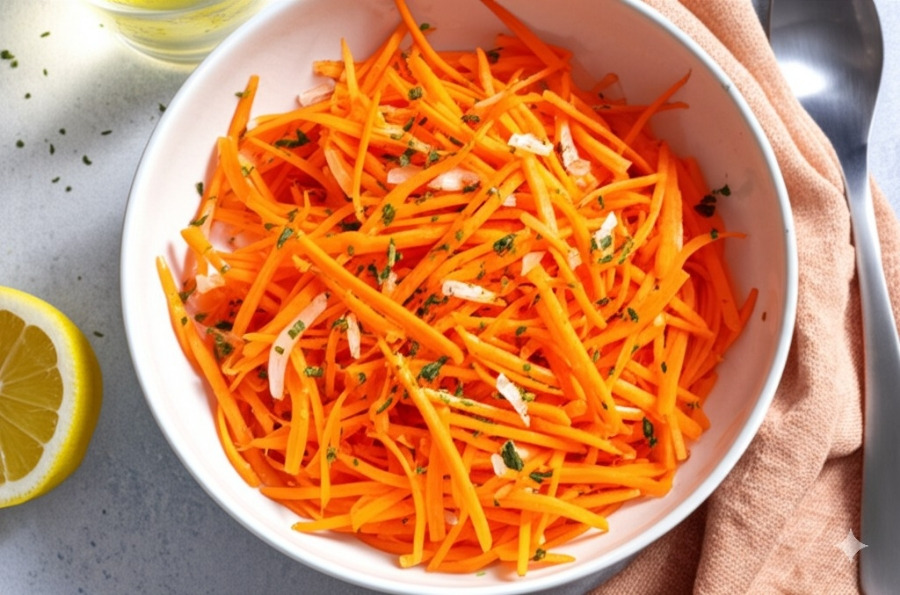 <이미지: 완성된 당근 라페 샐러드 (곱게 채 썬 밝은 오렌지색 당근에 신선한 파슬리가 뿌려져 있고, 윤기 있는 드레싱이 촉촉하게 버무려진 모습. 옆에는 드레싱 재료들이 살짝 보인다. 밝고 신선한 느낌의 플레이팅)>
