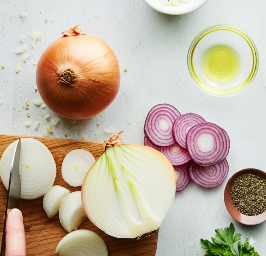 <이미지: 칼로 양파를 얇게 슬라이스하는 모습>