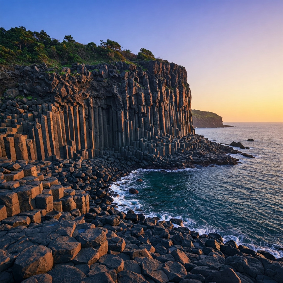 <이미지: 육각형 돌기둥이 겹겹이 쌓인 주상절리대의 모습>