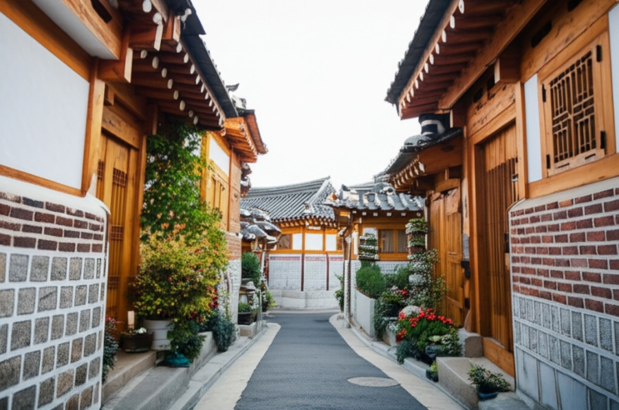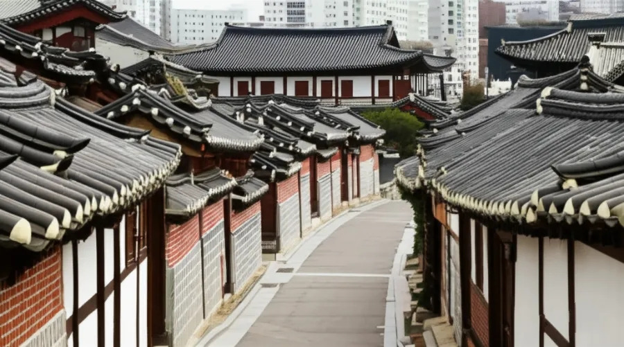 <이미지: 전통 한옥들이 옹기종기 모여 있는 북촌 한옥마을의 정갈한 풍경>