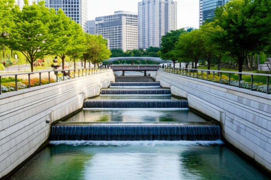 <이미지: 도심 속을 흐르는 청계천의 시원한 물줄기와 주변 산책로 풍경>