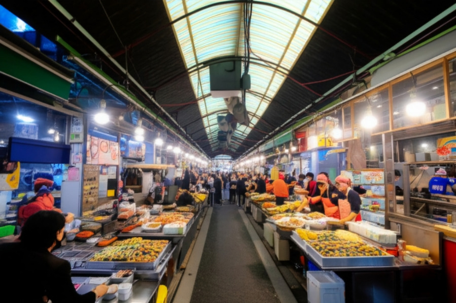 <이미지: 활기 넘치는 광장시장의 다양한 먹거리 노점과 사람들의 모습>