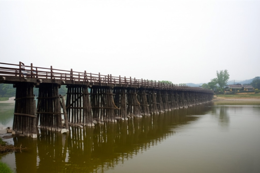 <이미지: 무섬마을의 외나무다리와 강변에 자리한 한옥들>