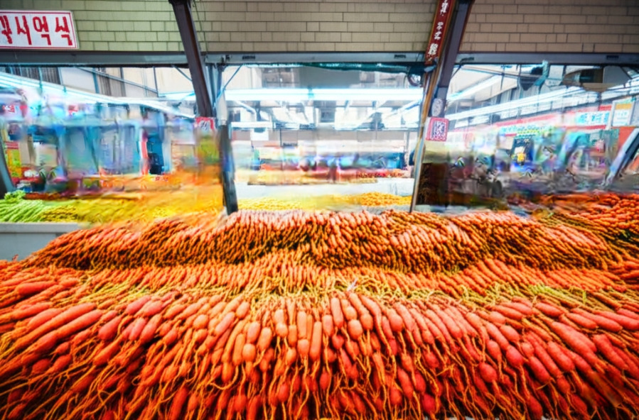 <이미지: 풍기 인삼 시장의 활기찬 모습과 진열된 인삼 제품들>