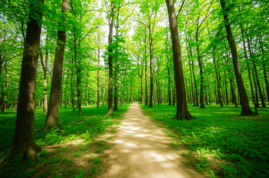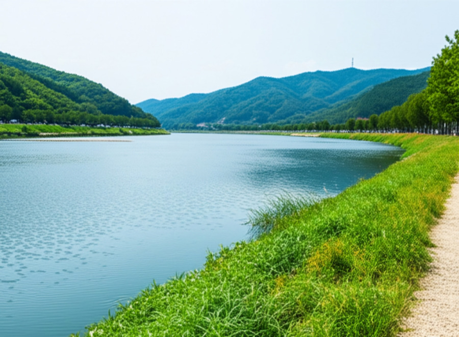 <이미지: 홍천강 생태공원 산책로 또는 수목원 숲길>