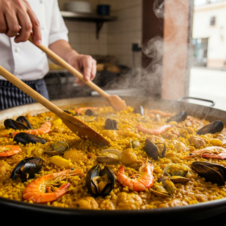 <이미지: 해산물이 올라간 빠에야가 팬에서 김을 내며 끓고 있는 모습. 밥알과 육수가 어우러져 있다.>