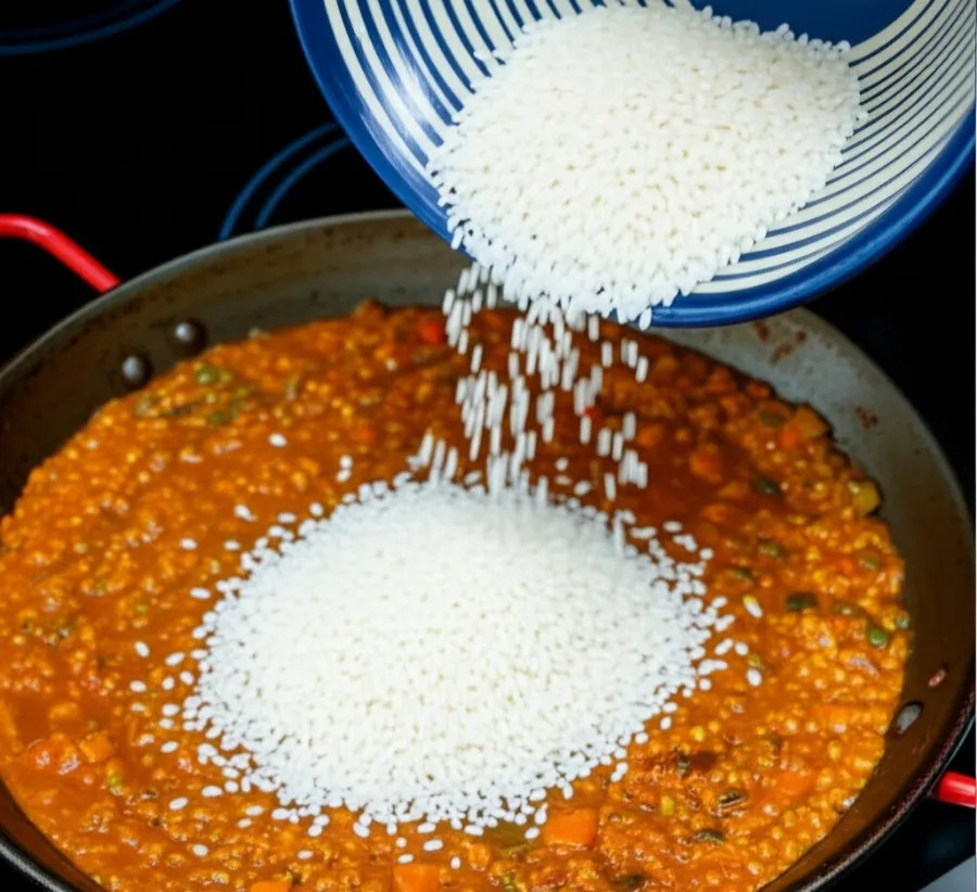 <이미지: 소프리토가 있는 팬에 쌀을 넣고 재료와 함께 섞어가며 볶는 모습.>