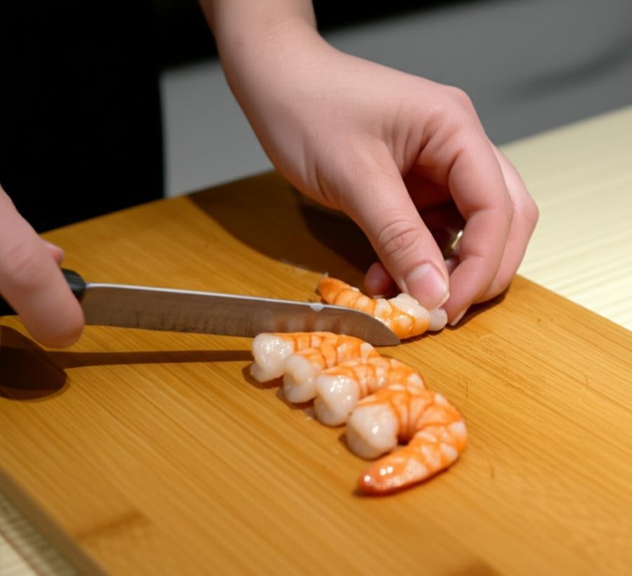 <이미지: 손가락으로 새우의 등 쪽 내장을 제거하거나 솔로 홍합 껍데기를 닦는 모습.>