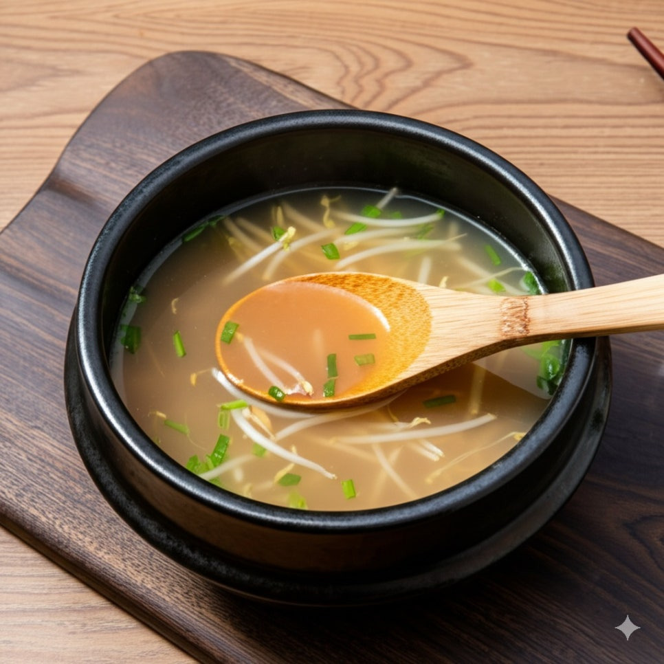 <이미지: 완성된 콩나물국 (맑고 시원한 국물에 콩나물과 파, 고춧가루가 떠 있는 모습. 뜨거운 김이 살짝 올라오고, 소박하지만 정갈한 뚝배기에 담겨 있음)>