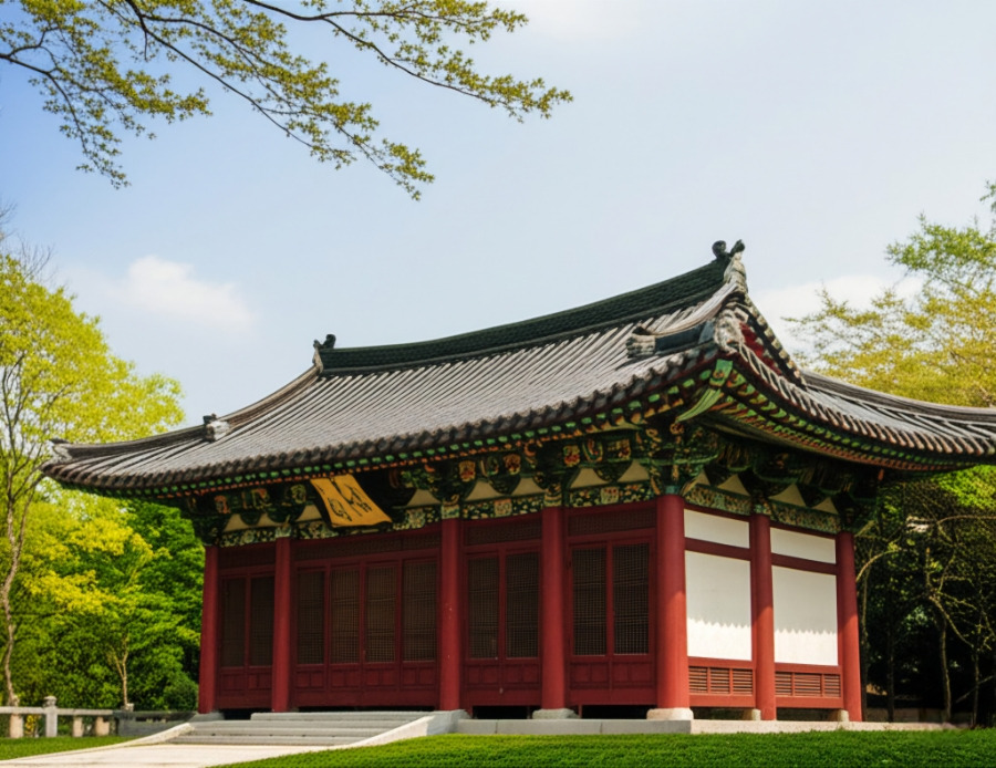 <이미지: 웅장하고 엄숙한 분위기의 현충사 건물과 푸르른 정원의 모습>
