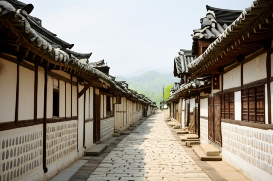 <이미지: 고즈넉한 분위기의 외암민속마을 돌담길과 전통 가옥들의 모습>