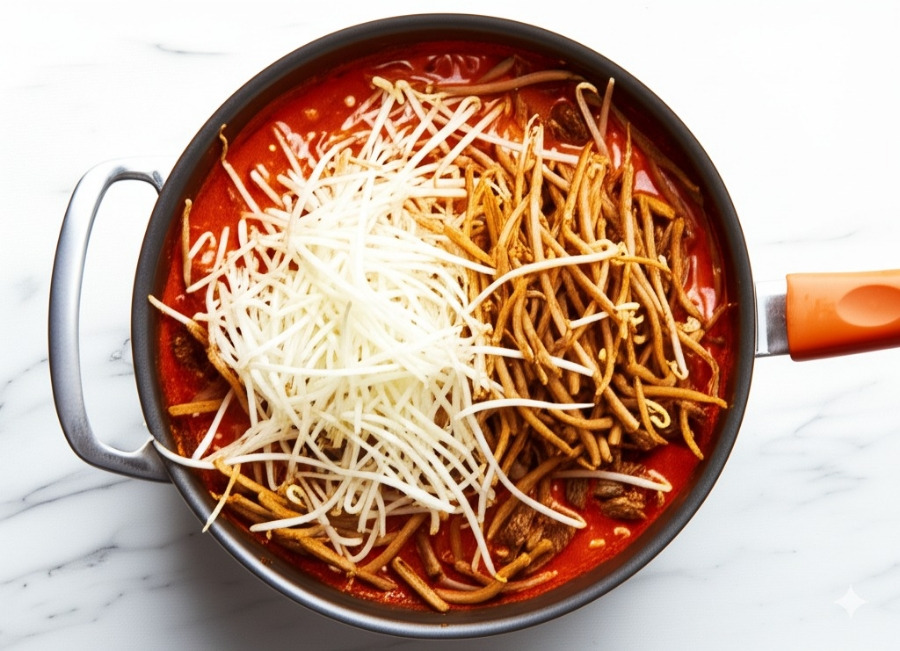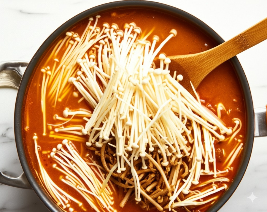 **<이미지: 숙주와 버섯을 넣고 끓이는 모습>**