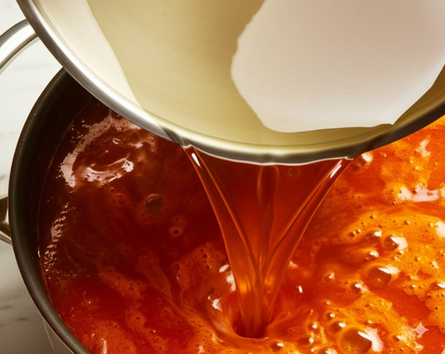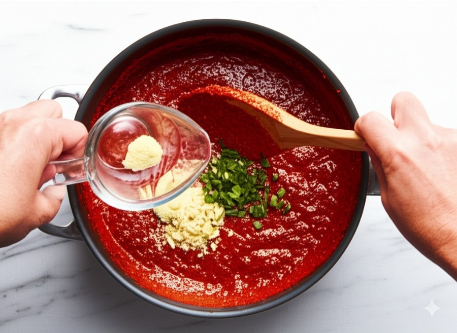 **<이미지: 만들어진 고추기름에 나머지 양념 재료를 넣고 섞는 모습>**