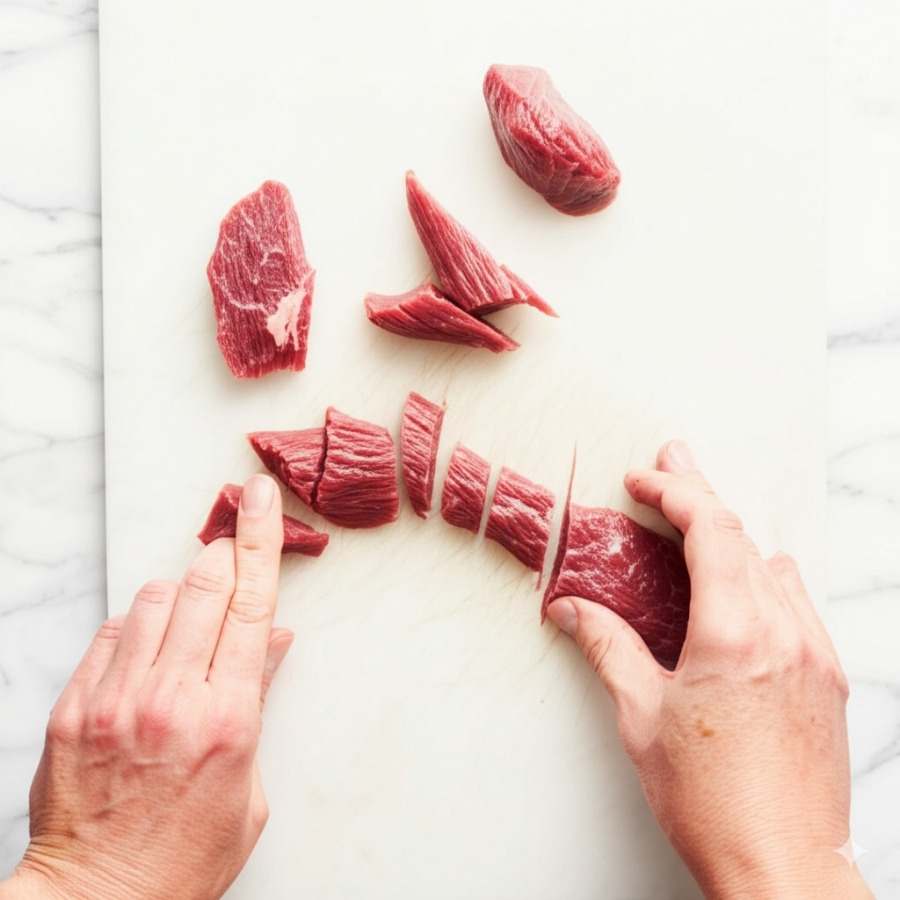 **<이미지: 삶은 소고기를 손으로 찢는 모습>**