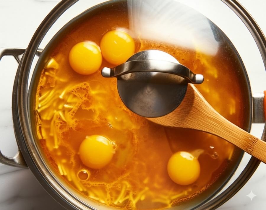 **<이미지: 풀어놓은 계란을 육개장에 넣는 모습>**