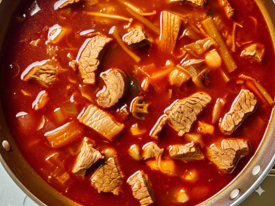 **<이미지: 육개장이 보글보글 끓고 있고, 찢은 소고기, 대파, 고사리 등이 보이며, 붉은 국물이 먹음직스러운 클로즈업 사진>**