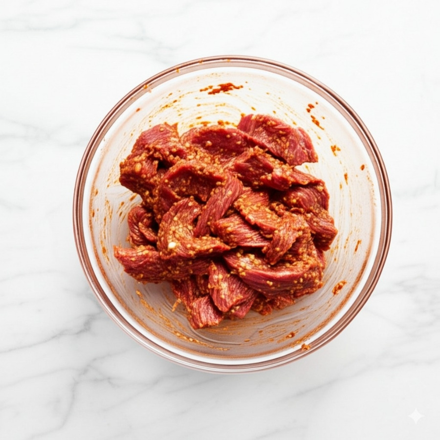 **<이미지: 찢은 소고기에 밑간 재료를 넣고 버무리는 모습>**