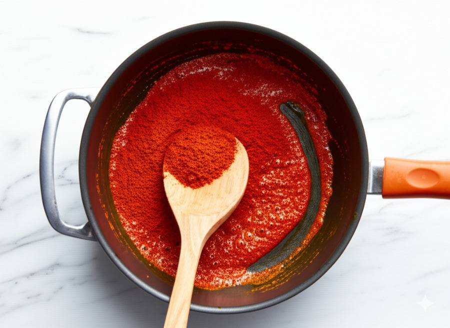 **<이미지: 냄비에 고춧가루와 식용유를 넣고 볶아 고추기름을 만드는 모습>**