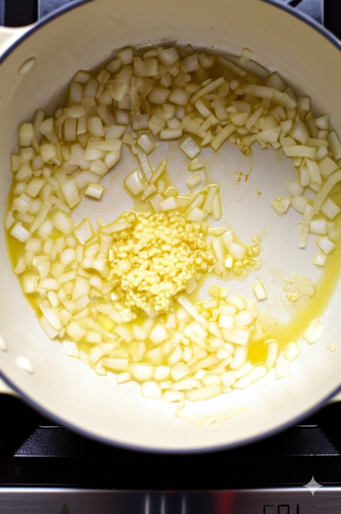 <이미지: 팬에 다진 마늘과 대파를 넣고 볶는 모습>