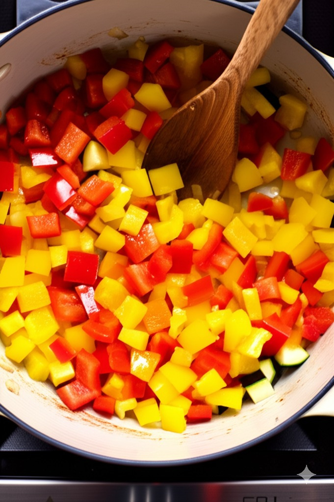 <이미지: 채소와 해산물을 함께 볶는 모습>