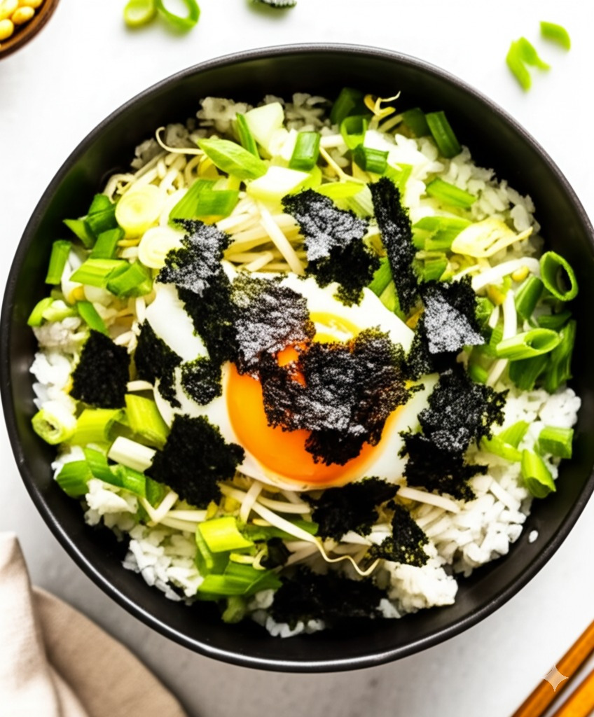 송송 썬 대파와 김가루를 듬뿍 올리고, 기호에 따라 수란을 올려줍니다. 마지막으로 참기름을 살짝 둘러주면 완성입니다!