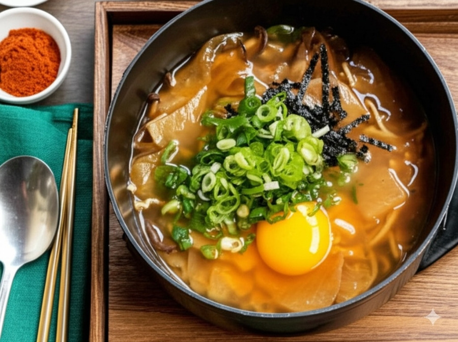 <이미지: 완성된 전주식 콩나물국밥 (뚝배기에 담긴 콩나물국밥 위에 김가루와 잘게 썬 김치, 그리고 수란이 올려져 있고, 국물이 보글보글 끓고 있는 모습. 따뜻하고 푸짐한 느낌)>