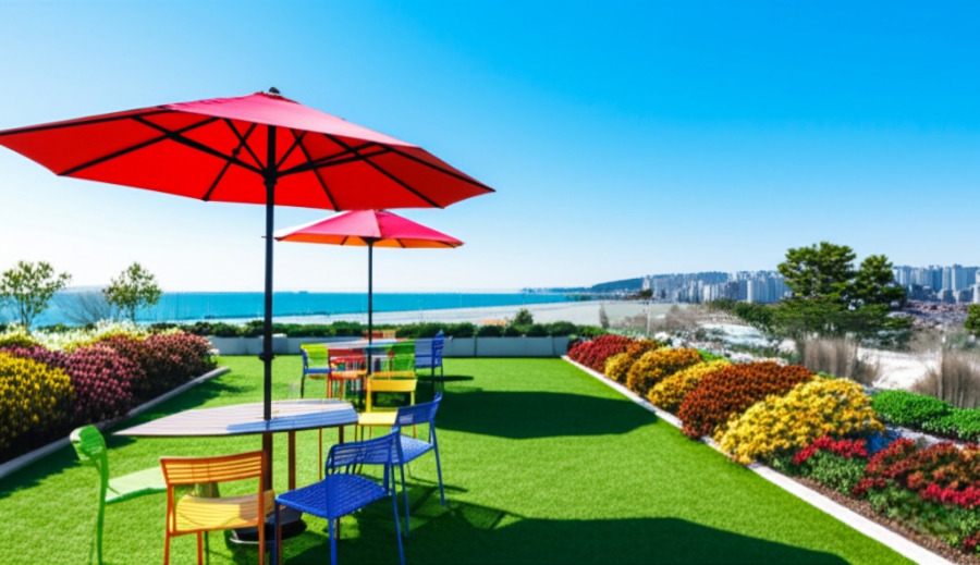 <이미지: 넓은 들판에 꽃이 피어있거나 탁 트인 공간에서 비행기를 볼 수 있는 하늘정원 또는 조용하고 아늑한 카페>