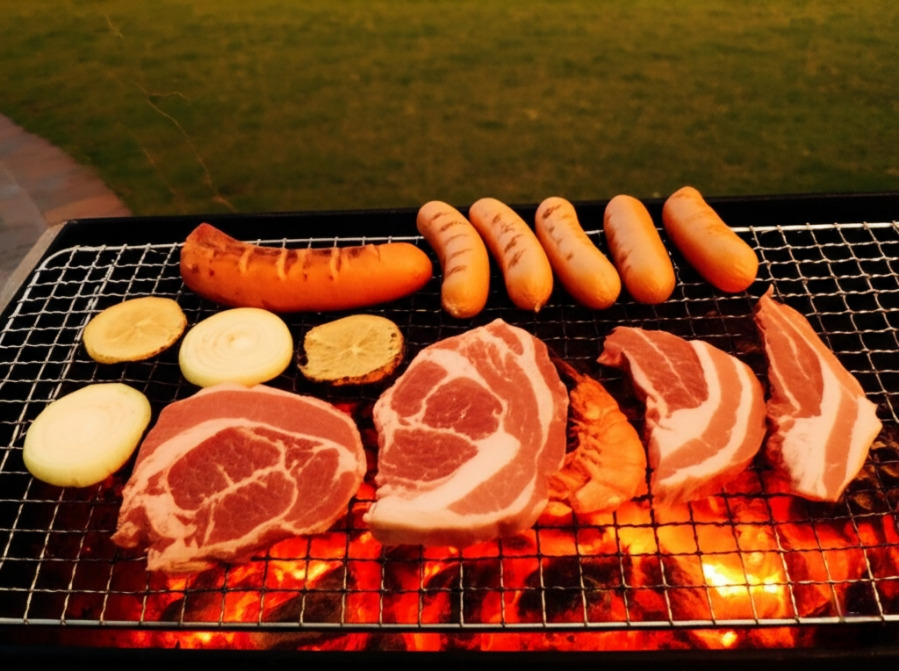 <이미지: 숯불 위에서 맛있게 익어가는 신선한 해산물이나 고기 바비큐>