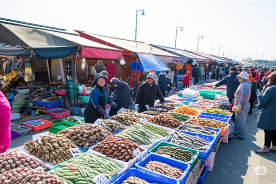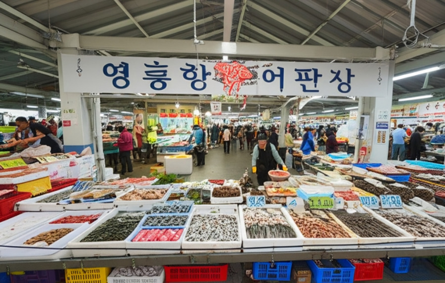<이미지: 만선의 기쁨이 느껴지는 영흥항 어판장의 싱싱한 해산물과 활기찬 분위기>