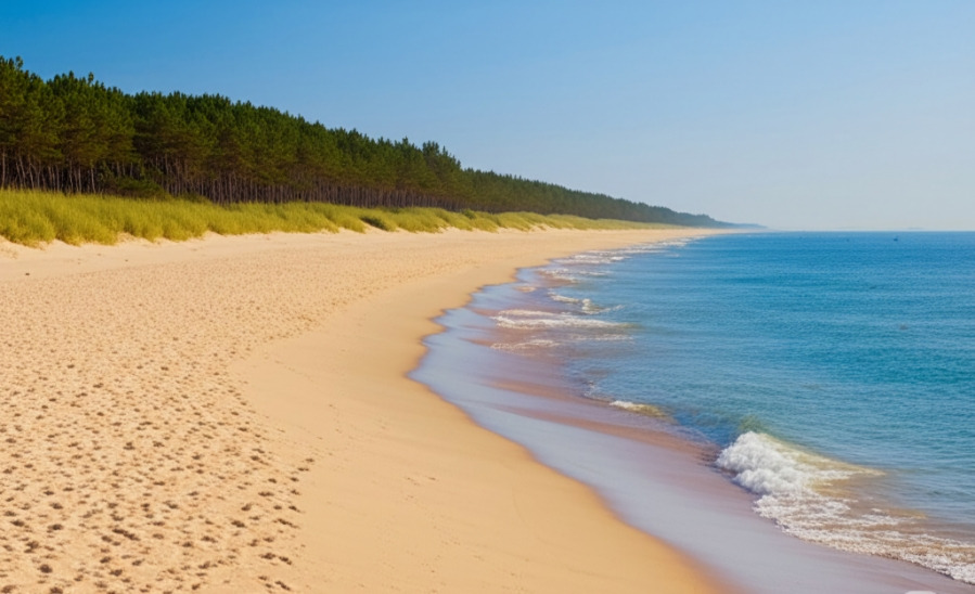 <이미지: 넓은 백사장과 울창한 소나무 숲이 어우러진 장경리 해수욕장의 평화로운 모습>