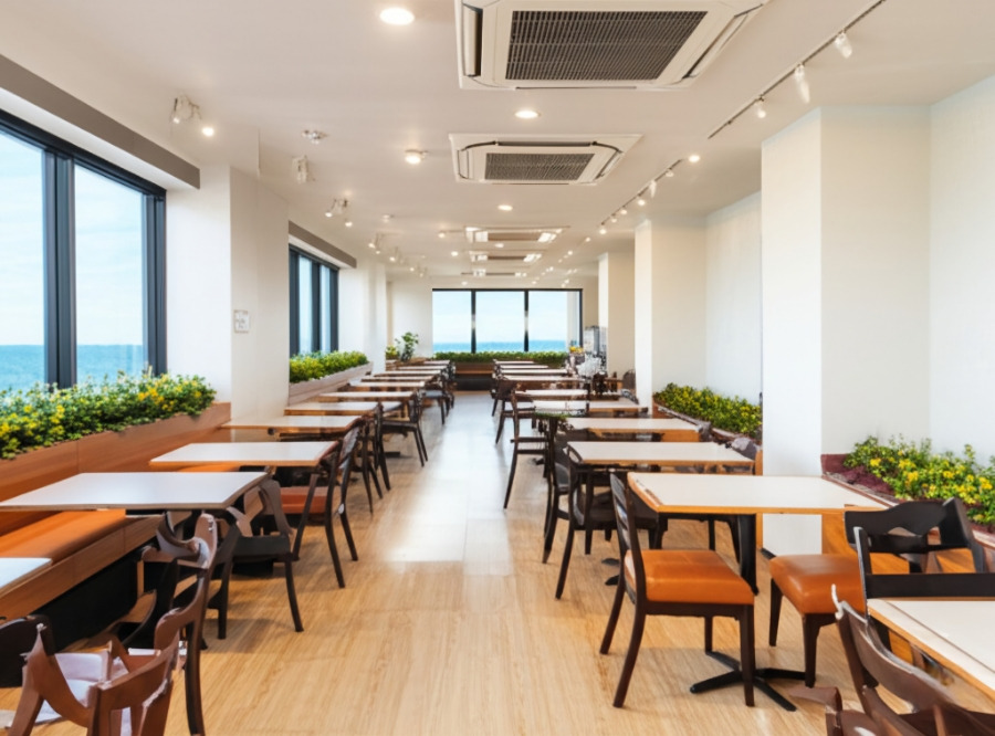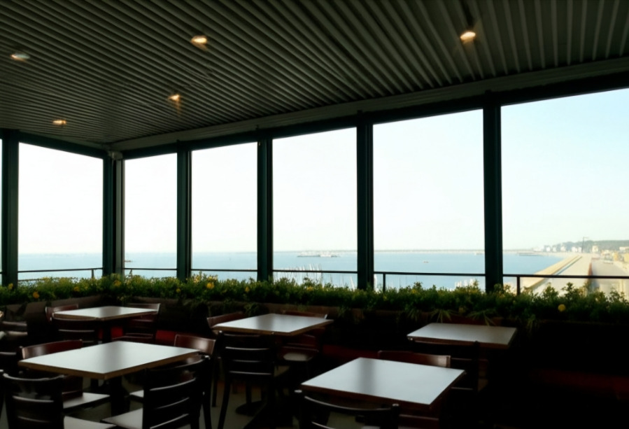 <이미지: 통유리창 너머로 푸른 바다가 펼쳐지는 감각적인 오션뷰 카페 내부>