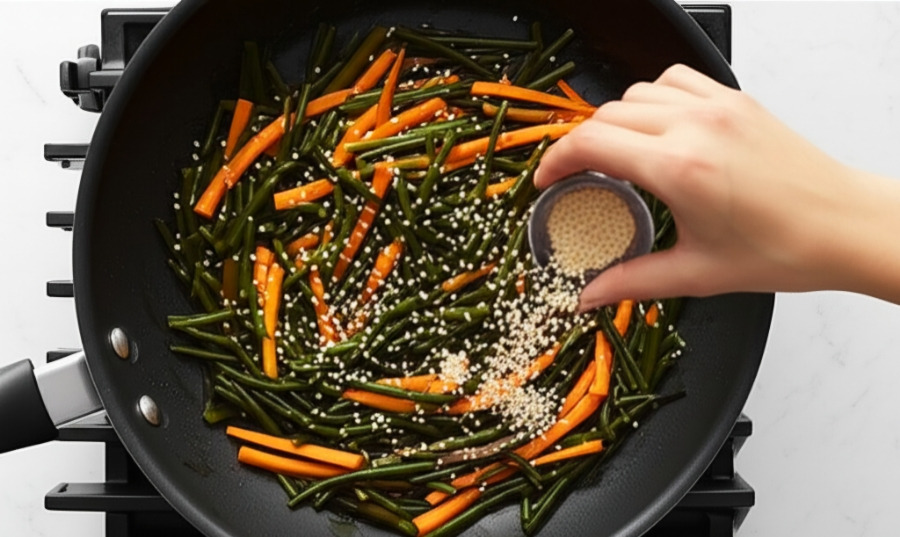 ① 불을 끄기 직전에 참기름과 통깨, (선택) 송송 썬 청양고추를 넣고 빠르게 섞어줍니다.