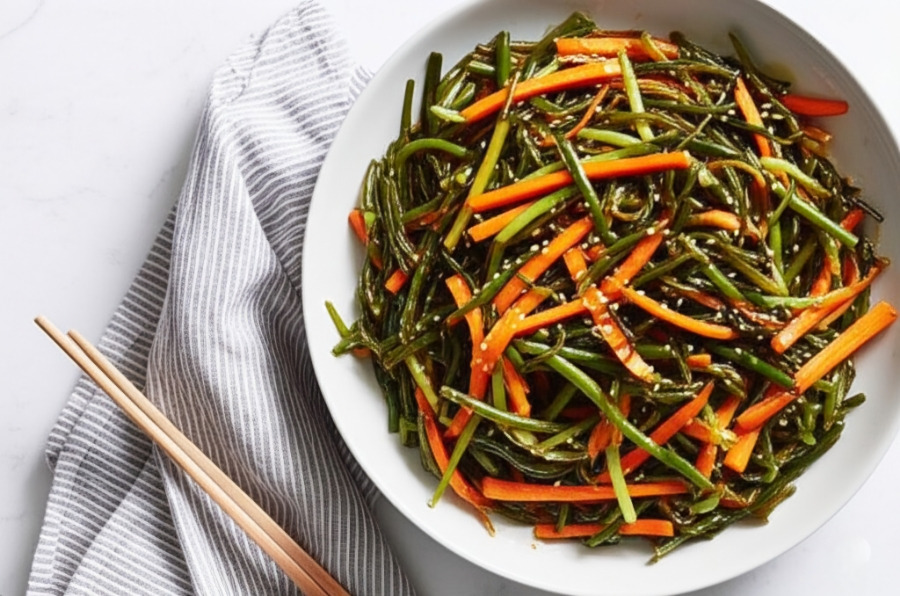<이미지: 작은 접시에 정갈하게 담긴 미역줄기볶음. 윤기 나는 초록색 미역줄기와 얇게 채 썬 주황색 당근, 하얀 양파가 어우러져 있고 통깨가 솔솔 뿌려져 있어 먹음직스러운 밑반찬 느낌을 준다.>