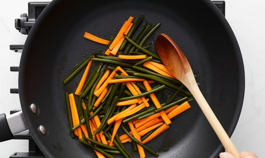 <이미지: 달궈진 팬에 식용유를 두르고 다진 마늘을 볶다가 채 썬 양파와 당근을 넣고 볶는 모습.>