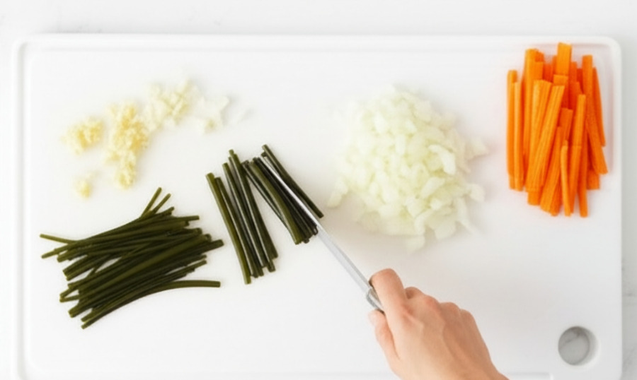 <이미지: 물기를 짠 미역줄기를 도마 위에서 칼로 먹기 좋은 길이로 자르는 모습.>