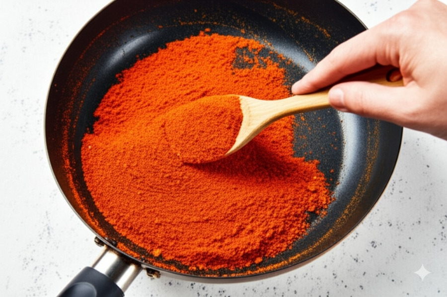 채소가 어느 정도 숨이 죽으면 고춧가루를 넣고 타지 않게 잘 볶아 고추기름을 내줍니다.