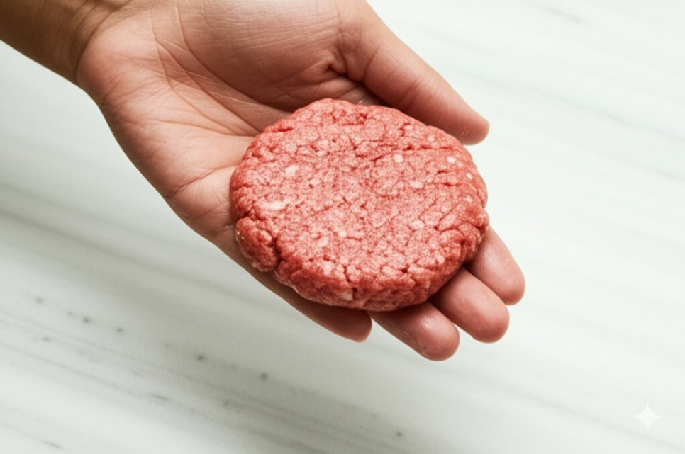<이미지: 동그랗게 빚은 함박 패티를 손으로 살짝 눌러 모양을 만드는 모습>