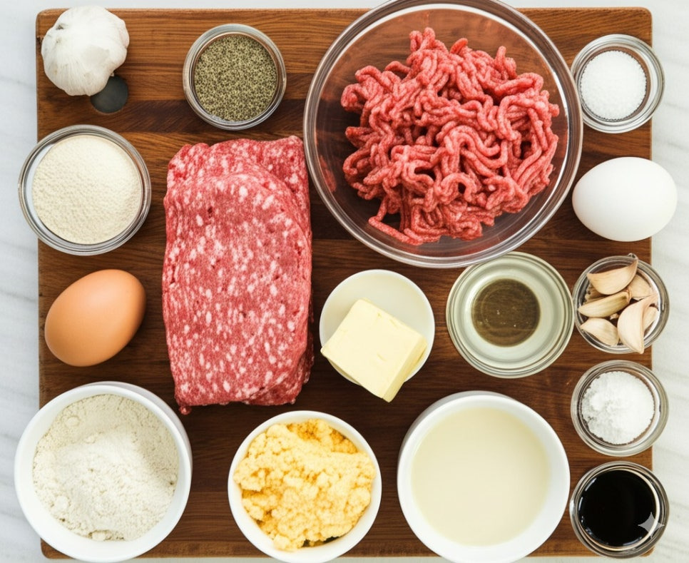 <이미지: 함박스테이크 재료 (다짐육, 양파, 빵가루, 우유, 달걀, 마늘, 소금, 후추, 넛맥, 버터, 밀가루, 케첩, 우스터소스 등) 과 곁들임 채소가 정갈하게 놓여있는 모습>