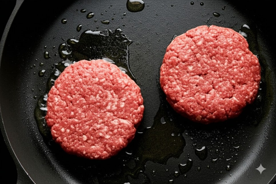 <이미지: 달궈진 팬에 함박 패티를 올려 굽는 모습>