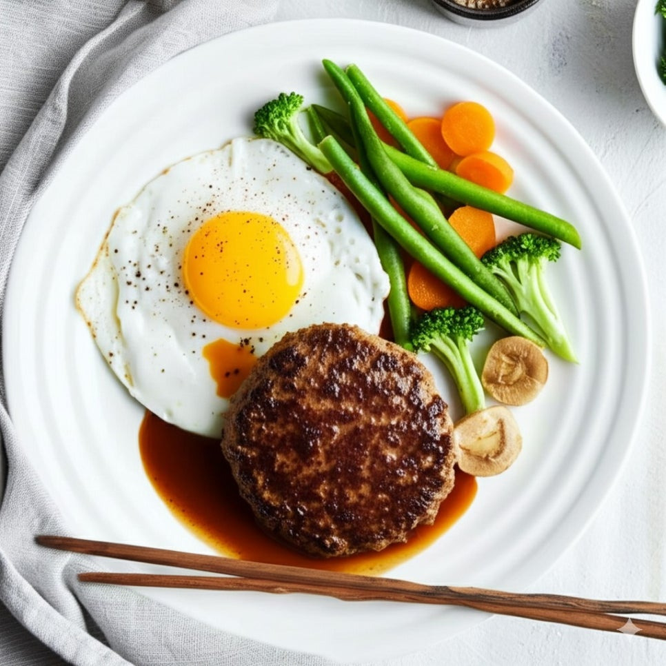 <이미지: 완성된 함박스테이크 (윤기가 흐르는 갈색 소스가 듬뿍 뿌려진 촉촉한 함박스테이크와 곁들여진 구운 채소, 반숙 계란이 함께 담긴 접시. 고급스러운 분위기)>