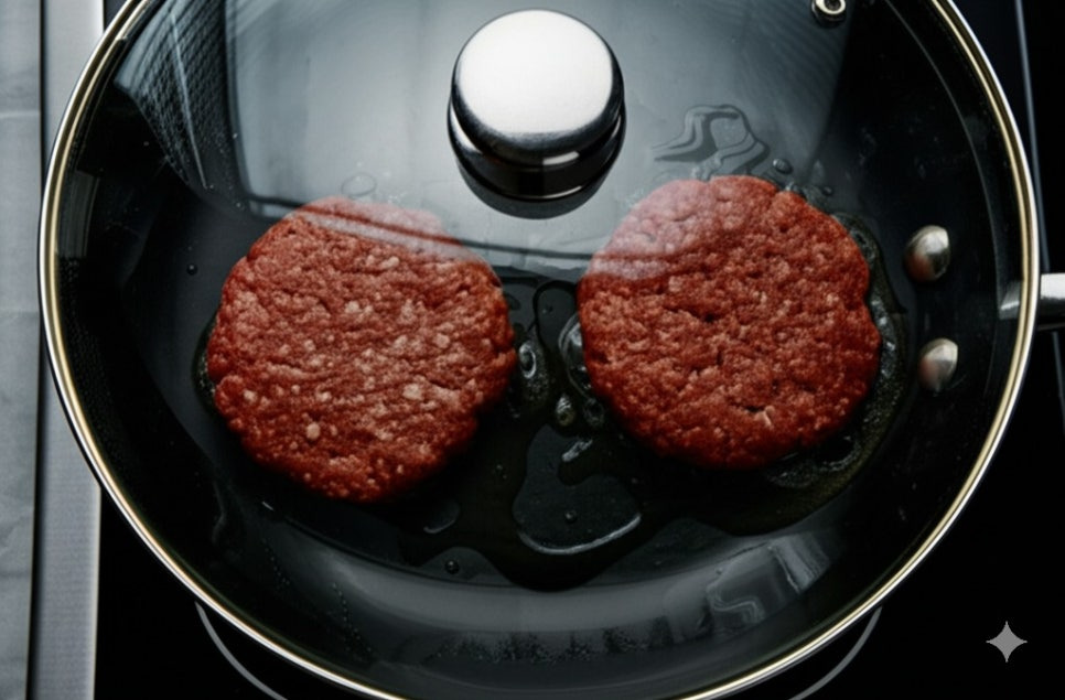 <이미지: 뚜껑을 덮고 약불에서 함박 패티를 익히는 모습>
